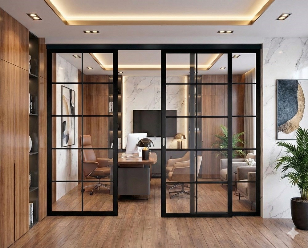 Алюминиевая раздвижная межкомнатная перегородка из коллекции Loft Standart. Стоимость просчитывается индивидуально и зависит от размера проема, типа остекления, сложности обрамления проема.
